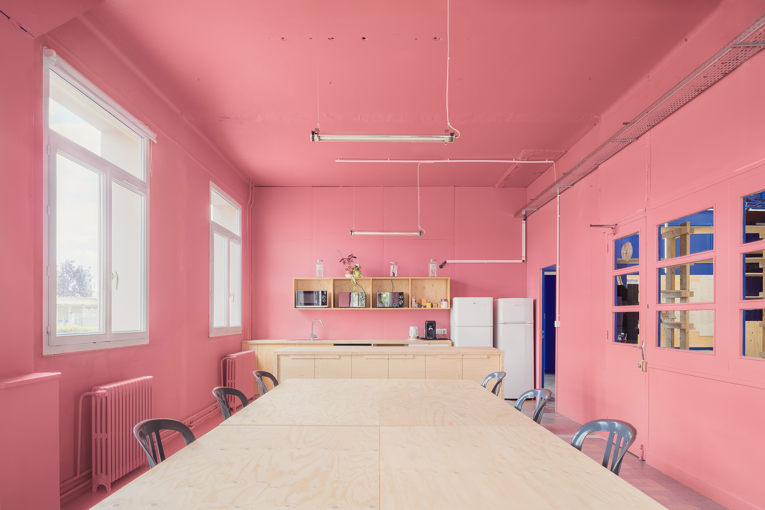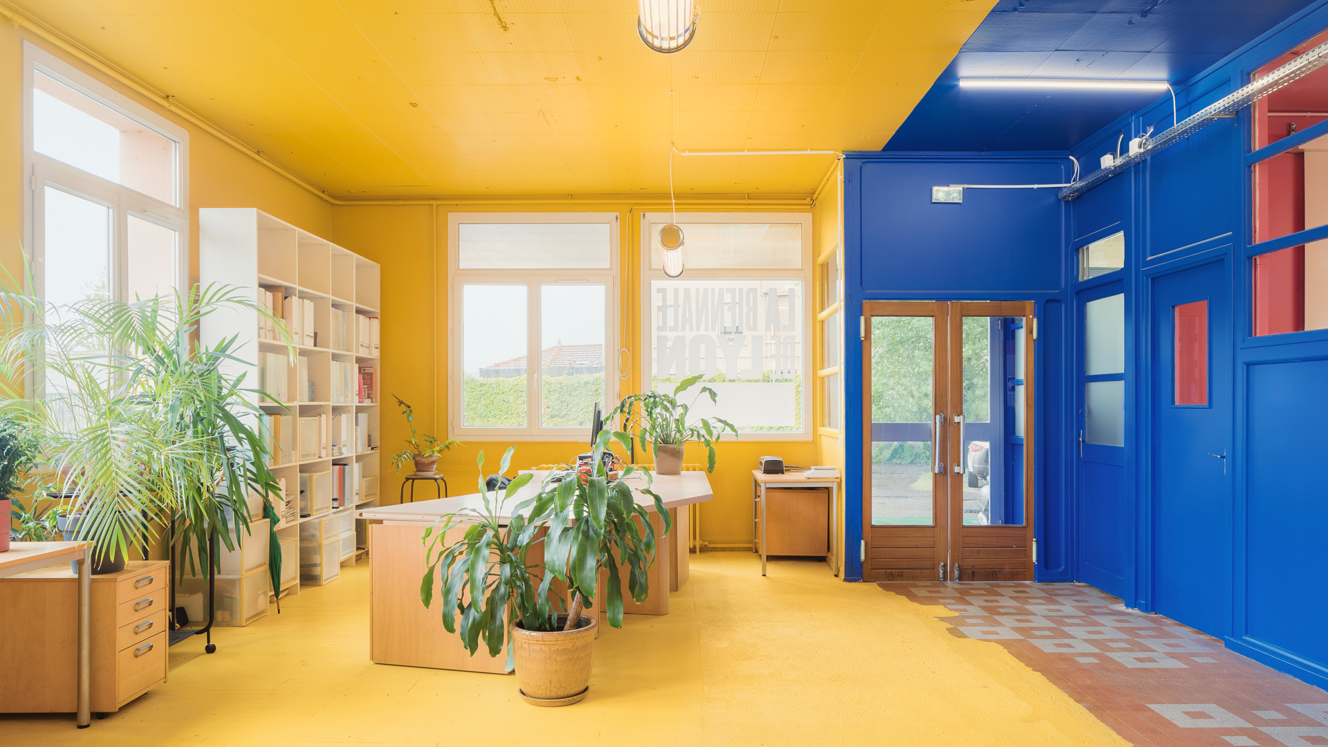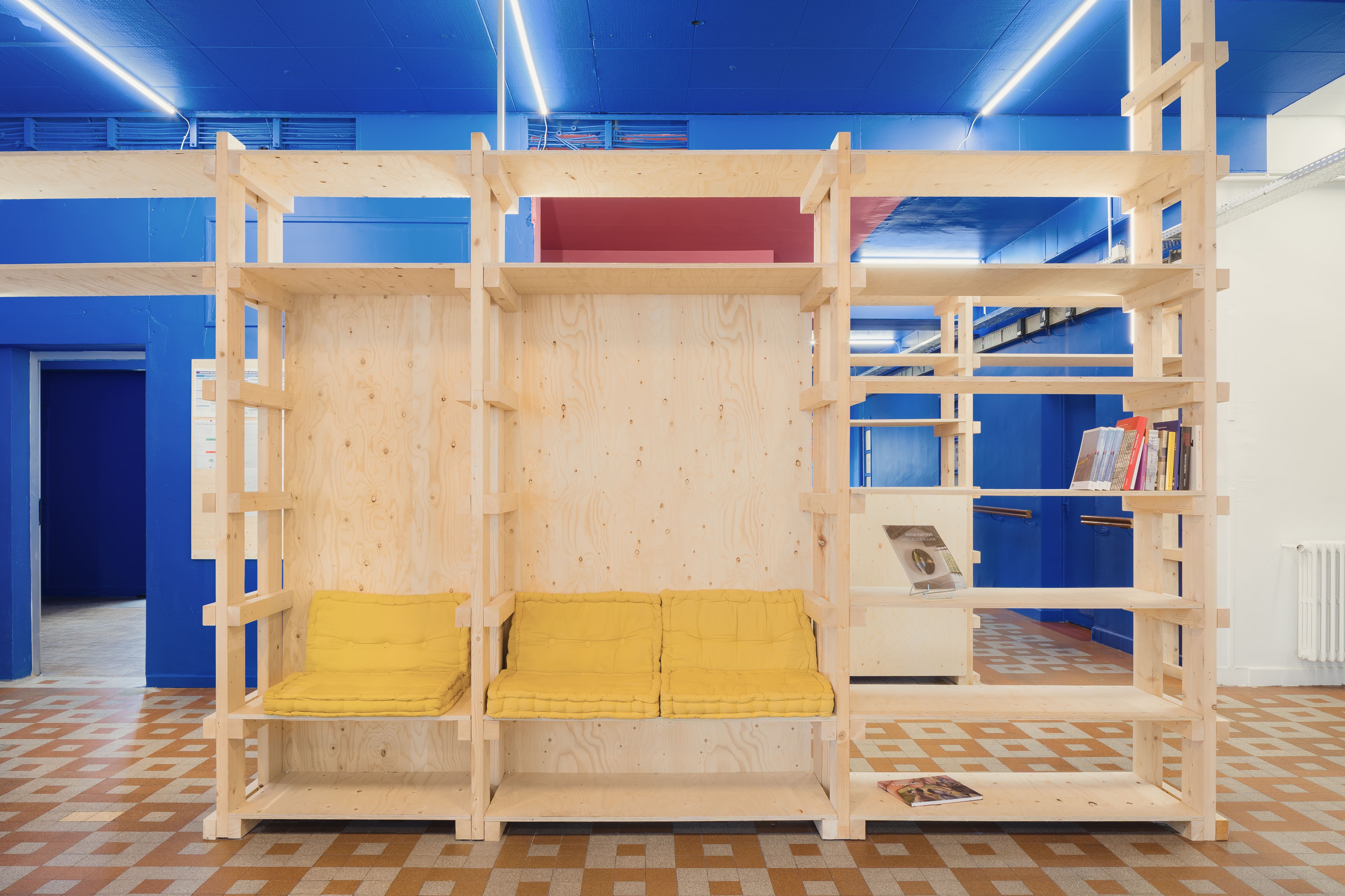 Des étagères en bois sur mesure permettent d’aménager les différents espaces sont réalisées en bois issu de la scénographie des expositions des biennales. Les ajouts comme les nouveaux réseaux électriques, le mobilier se détachent de l’intervention chromatique. Les aplats de couleurs viennent recouvrir l’existant, harmoniser mais également magnifier les imperfections et petits désordres de l’édifice. Telle une oeuvre d’art monochrome, la lumière, la matière et la volumétrie de l’architecture sont ainsi mises en valeur.
