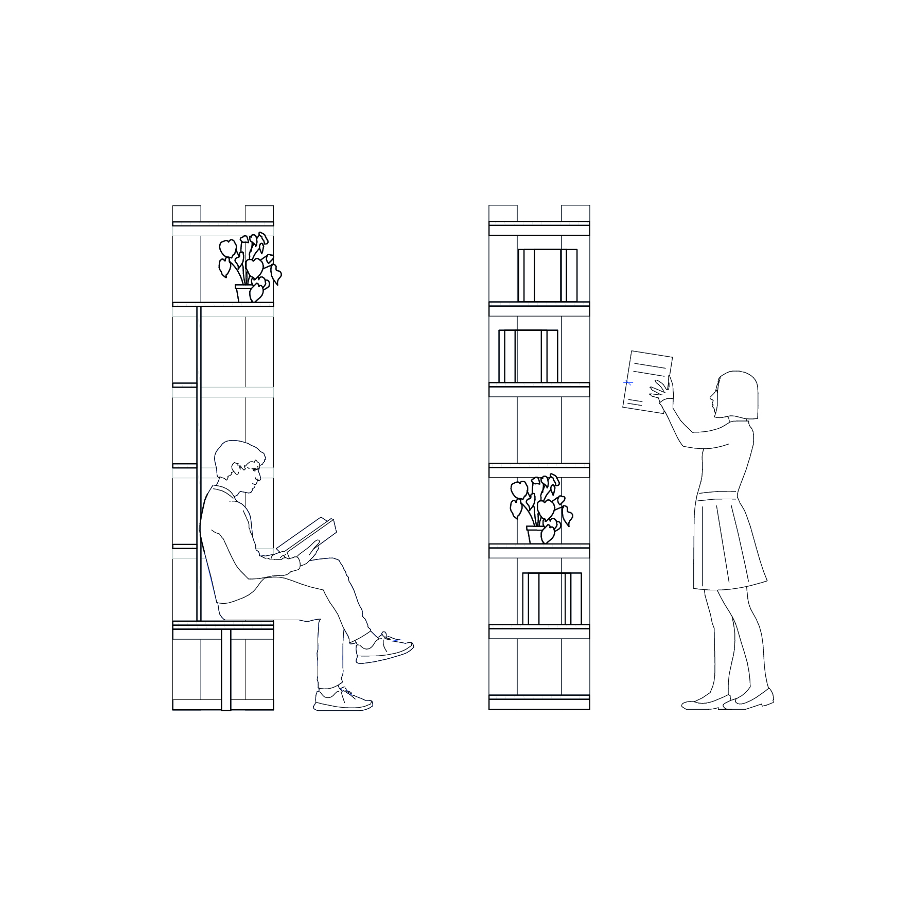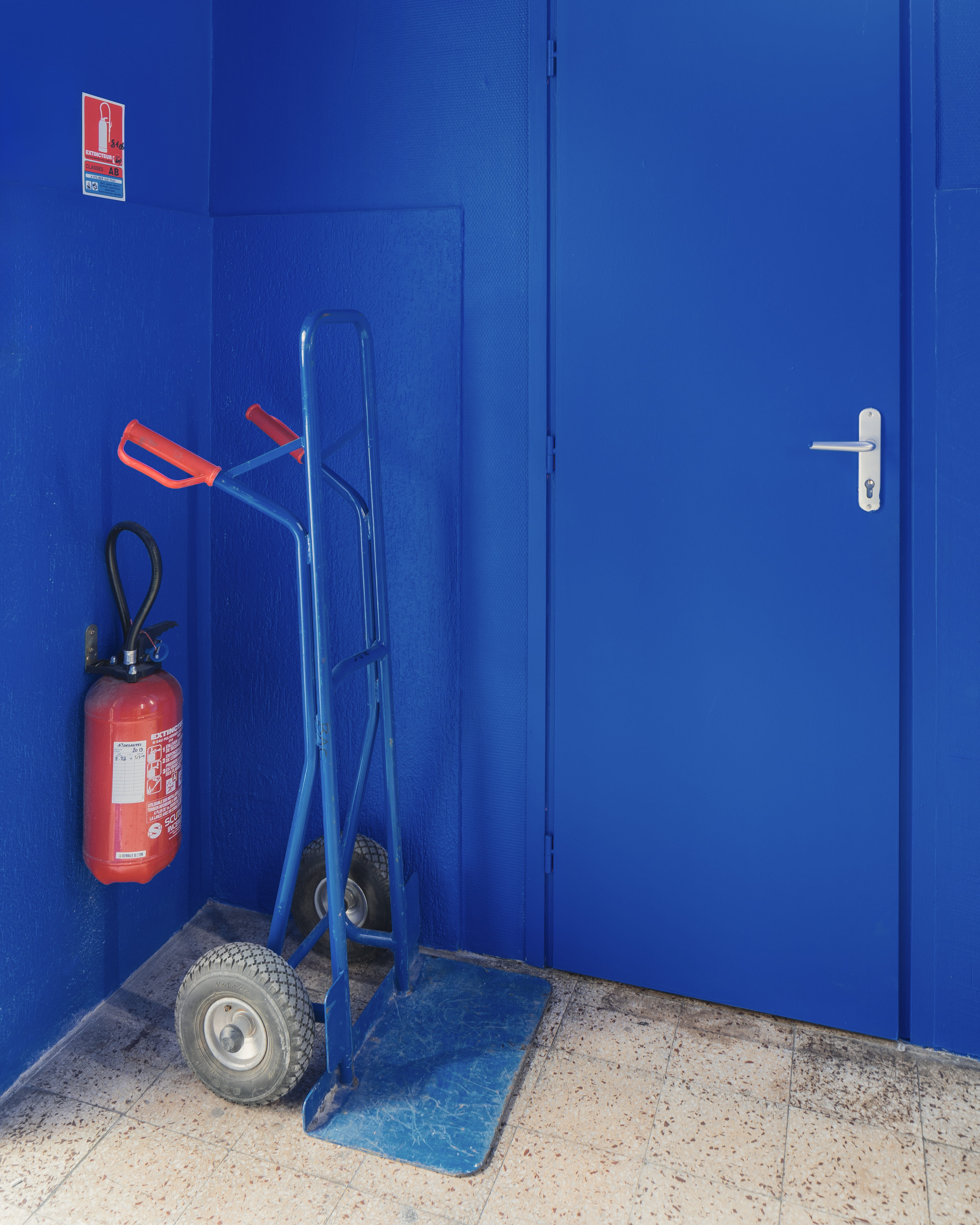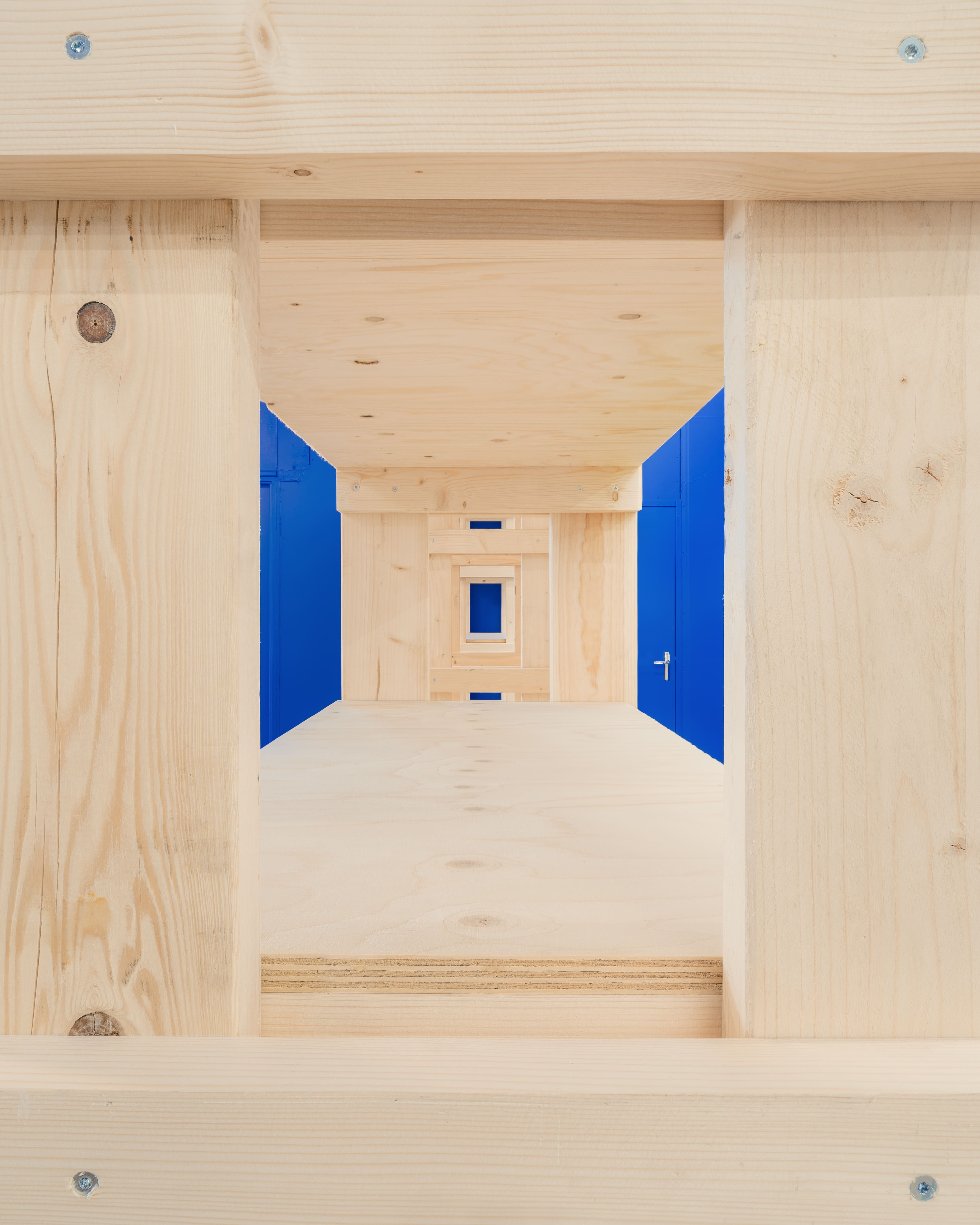 Des étagères en bois sur mesure permettent d’aménager les différents espaces sont réalisées en bois issu de la scénographie des expositions des biennales. Les ajouts comme les nouveaux réseaux électriques, le mobilier se détachent de l’intervention chromatique. Les aplats de couleurs viennent recouvrir l’existant, harmoniser mais également magnifier les imperfections et petits désordres de l’édifice. Telle une oeuvre d’art monochrome, la lumière, la matière et la volumétrie de l’architecture sont ainsi mises en valeur.