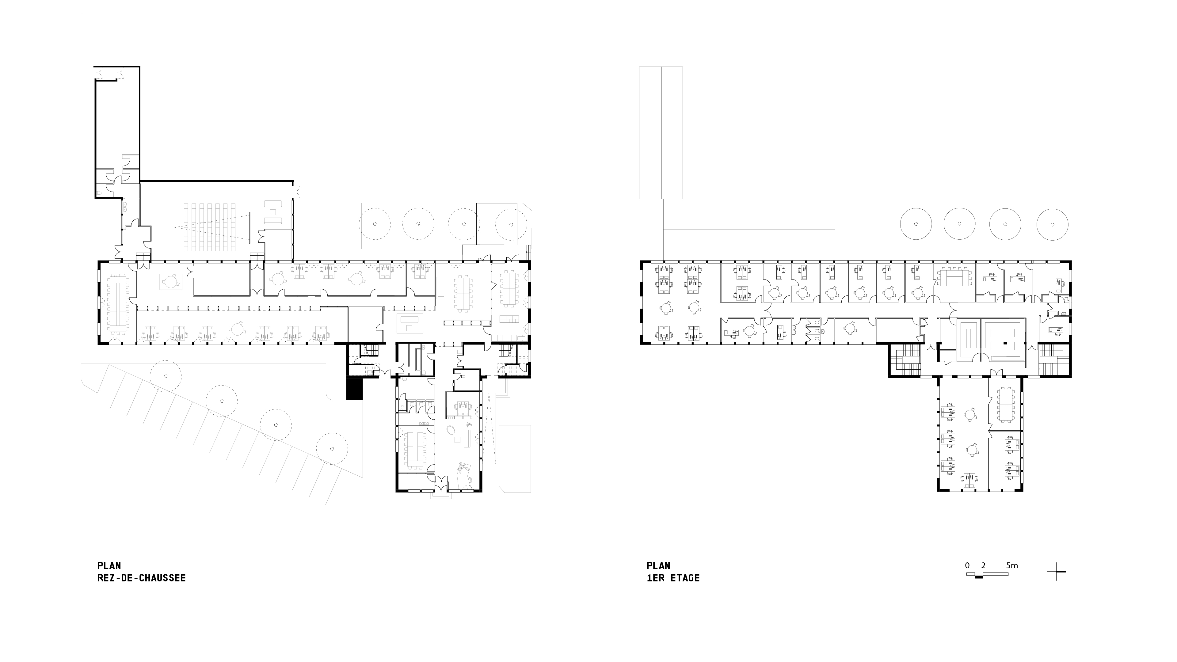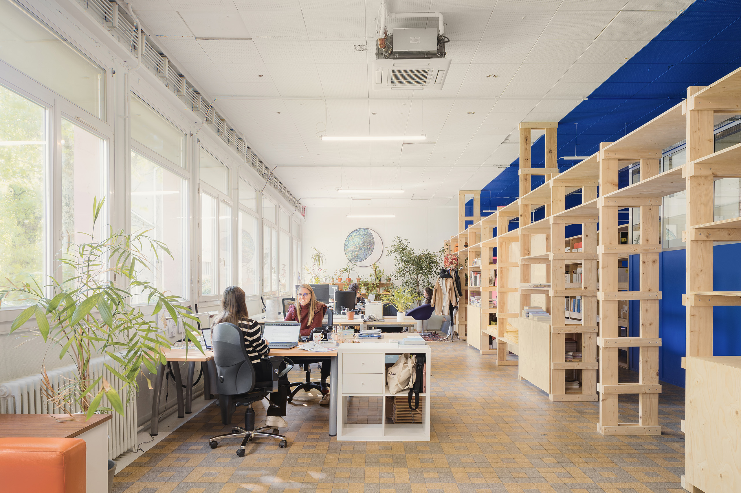 Les sols existants tels que les carreaux de terrazzo ou les parquets en bois massif ont été révélés et mis en valeur, ils participent à la structuration des différents espaces de travail.
